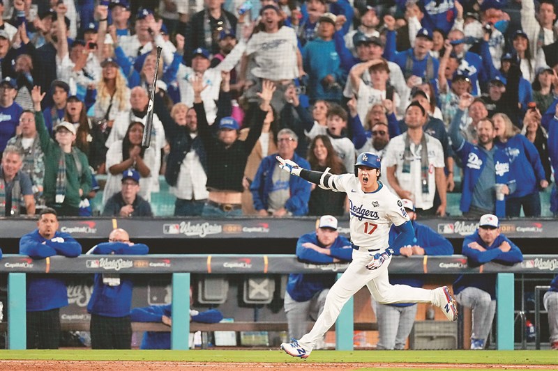 美國職棒大聯盟世界大賽的第3戰,27日在加州洛杉磯的道奇體育場舉行,道奇隊指定打者大谷翔平第7局擊出全壘打後舉手歡呼。圖/美聯社