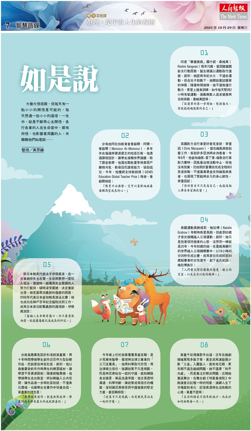 「生活的精采不因年齡減少,而在於如何面對每一天。」