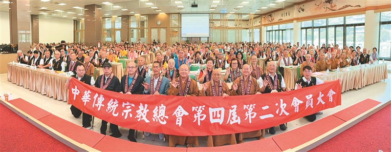 中華傳統宗教總會第四屆第二次會員大會暨第四屆第三次理監事聯席會議,25日於佛光山佛陀紀念館五觀堂舉行,主席中華傳統宗教總會總會長心保和尚(前排中),以及副總會長北港朝天宮董事長蔡咏鍀(前排左4)、指南宮主任委員高超文(前排左3)和木柵聖母宮主任委員黃承國(前排左2),監事長慈容法師(前排右4)、理事如常法師(前排右3)、祕書長陳和順(前排右2)等出席,共約670人參與。圖/佛光山佛陀紀念館提供