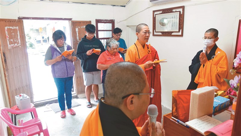 佛光山月光寺監寺妙勳法師(第2排)10月27日至光復災區,為佛光人吳素珍家中佛堂安座灑淨。87歲老菩薩吳素珍(第3排)與兒子、女兒、孫子虔誠參與。圖/人間社記者簡美換