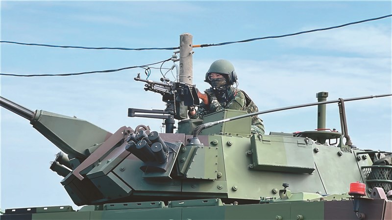 國軍10軍團昨在雲林縣展開大規模的陸勝1號操演,由234旅官兵進行地空整體作戰,包括運用科技「TAK手機指揮系統」把戰場實況視訊傳給指揮中心,增加戰力機動,並出動眼鏡蛇直升機,以空中火力壓制,展開「陸航、戰、甲車部隊協同作戰」,軍事專家說,這是一場有別於傳統的現代科技資訊戰。圖為女兵在裝甲車上猛烈射擊,掩護士兵往目標陣地前進。圖/蔡維斌