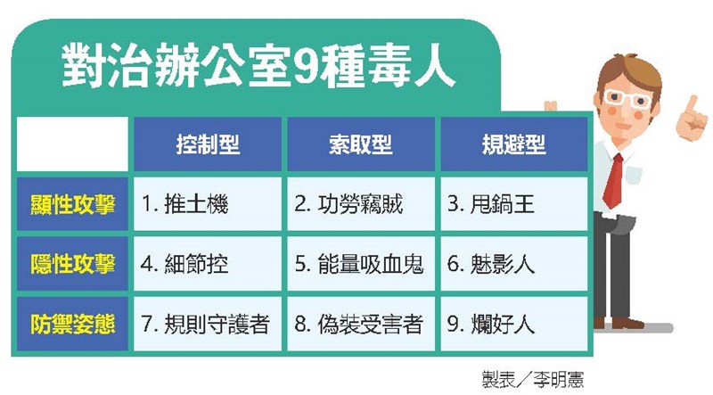 1.工具化現場。 先用(左表)列出的「毒人九宮格」,辨識職場對手屬於那一種「毒人」。這些毒人或許並非壞人,卻足以破壞他人生涯之路,建議員工善用「50句拒絕話術(見《巧推職場九種毒人解方》電子書)」自保,主管則透過「24小時SOP」應變辦公室霸凌。
