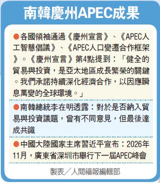 APEC慶州宣言 聚焦AI、人口挑戰 本報綜合外電報導 |2025.11.02 語音朗讀 87觀看次 字級 大 中 小 南韓慶州APEC峰會領袖合影時,台灣領袖代表林信義(左2)與中國大陸國家主席習近平(左4)擦身而過,全程無互動。圖/APEC台灣媒體團提供南韓慶州APEC成果 製表/人間福報編輯部今年APEC峰會1日在南韓落幕,領袖合影,地主國南韓總統李在明(前排右6)與下屆主辦國中國大陸國家主席習近平(前排右7)比肩而站,我方領袖代表是林信義(後排右1)。 圖/法新社 【本報綜合外電報導】為期兩天的亞太經合會(APEC)峰會,1日在南韓慶尚北道慶州市落幕,21個成員國領袖通過《慶州宣言》,聚焦AI與人口結構變化等挑戰,並將推動包括亞太自貿區(FTAAP)議程在內的亞太經濟整合,克服中美貿易戰帶來的挑戰。在《慶州宣言》聲明中,APEC領袖「承認全球貿易體系持續面臨重大挑戰」,而「蓬勃的貿易與投資對亞太地區的成長與繁榮至關重要」。APEC部長級會議也在會後發表聯合聲明,強調促進貿易投資和提升供應鏈韌性等,以強化區域連結。林信義與習近平 擦身而過無互動聲明指出,APEC成員國持續以「APEC布城願景2040」(APEC Putrajaya Vision 2040,是2020年馬來西亞APEC峰會時通過的一項20年發展藍圖)為指引,致力於建立一個「自由、開放、公平、非歧視、透明且可預測」的貿易環境。此外,APEC領袖另外發布2份獨立聲明,其中一份聲明《APEC人工智慧倡議》指出,人工智慧(AI)作為一種可能的經濟催化劑,當前快速演變的數位環境,卻也帶來挑戰,各國需要採取一致對策,來因應AI的變化。另一份聲明《APEC人口變遷合作框架》則敦促各國展開合作,解決生育率下降、人口老化及加速都市化等問題。東道主南韓總統李在明表示,APEC成立於1989年,目的在推動自由開放的貿易與投資,希望成員經濟體能透過創新理念開展合作,從促進惠及子孫後代的包容性增長,到制定基於AI的戰略來應對人口挑戰。中國國家主席習近平10月31日在峰會表示,中國將支持全球自由貿易與供應鏈穩定,此舉明顯將中國定位為美國總統川普保護主義政策下的另一種選擇。在致APEC企業領袖高峰會的一份書面發言中,習近平更直言:「投資中國,就是投資未來。」習近平1日在APEC會議提出3點倡議,包括:推動人工智慧朝著有益、安全、公平方向健康有序發展。他倡議成立「世界人工智慧合作組織」,盼通過發展戰略、治理規則、技術標準等合作,積極為國際社會提供公共產品。昨天上午的領袖大合照時,習近平站定後與新加坡總理黃循財聊天,較晚進場的林信義經過習黃時,未跟他們有交流或致意。林信義在慶州舉行記者會說,從深談、場邊會晤到握手寒暄都是互動,有時候要看機緣。林信義去年代表賴清德總統出席APEC秘魯峰會時,與中國大陸國家主席習近平打招呼。深圳APEC峰會 大陸第3次當東道主林信義說明此行成果表示,他與美國財政部長貝森特會談30分鐘至40分鐘,貝森特對台灣建立半導體產業聚落充滿興趣,他也與日本首相高市早苗會談;高市在社群平台X分享與林信義的會談,希望深化台日合作。習近平在APEC會議東道主交接環節時,正式宣布,2026年11月將在中國廣東省深圳市舉辦下屆APEC會議,這將是繼2001年上海、2014年北京後,時隔12年由中國第3次主辦。 前一篇文章 習近平見高市早苗 籲日恪守中日四個政治文件 下一篇文章 習李會加強中韓戰略溝通 促北韓重返對話 熱門新聞 01佛光山在家戒會 海內外戒子行佛2025.10.2702星雲大師全集【經義】佛法滿人間—心能轉境2025.10.2703紐國馬努考東區警局培訓 北島佛光山召開2025.10.2804【小土豆日記】泡麵來襲2025.10.2705跆拳世錦賽 18歲劉侑芸奪金2025.10.2706台北動物園壁畫 展現野性生命力2025.10.2707【台灣媽媽在荷蘭】網路世界 不能有話就說2025.10.2708巨型卡通登維港2025.10.2709中美談妥 貿易協議框架2025.10.2710星光水岸樂園 親子暢快消暑2025.10.27 訂閱電子報 台北市 天氣預報 台灣一週天氣預報 相關報導 習李會加強中韓戰略溝通 促北韓重返對話習近平見高市早苗 籲日恪守中日四個政治文件輝達攜南韓 打造主權 AI 基建習川會沒談台灣 美降關稅、陸暫停稀土管制梵蒂岡跨宗教對話60周年 教宗喜會中華人間佛教代表輝達總部選址確定 落腳北士科T17、T18 作者其他文章跟進南韓 日評估引進核動力潛艦 習李會加強中韓戰略溝通 促北韓重返對話習近平見高市早苗 籲日恪守中日四個政治文件輝達攜南韓 打造主權 AI 基建習川熱線 傳聚焦台灣軍援軍售、TikTok議題 開挖土機遊大陸 填坑修路做好事