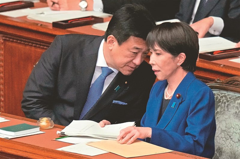 日本內閣官房長官木原稔(左)表示,將與首相高市早苗(右)討論修訂安全保障相關文件細節。圖/美聯社