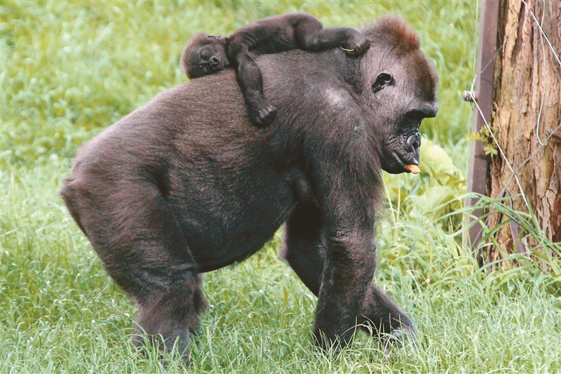 一隻揹著寶寶的黑猩猩媽媽。 圖/法新社、美聯社