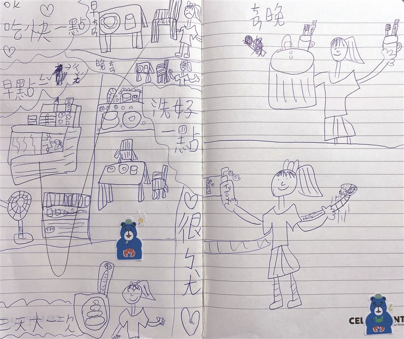 最後,向來古靈精怪的女兒,產出這份檢討圖(請容許我以母親視角簡單說明:內容大抵是加強用餐時間觀念、避免賴床、洗淨餐碗、定時如廁、梳洗沐浴備忘錄)呈交,雖然令人感到哭笑不得,但終究還是忍不住稱讚了她。
