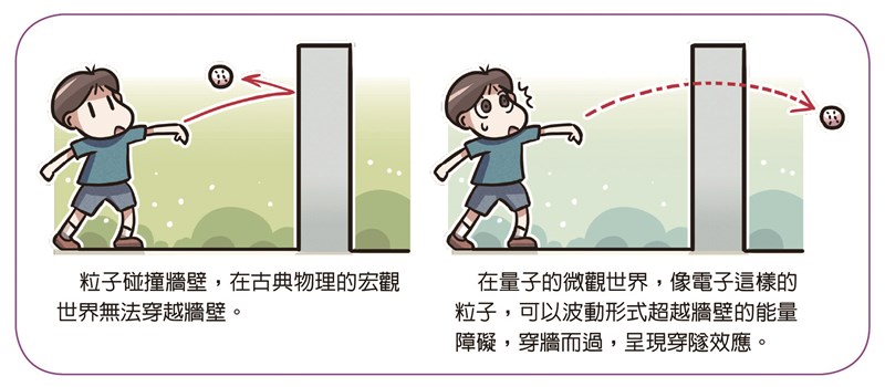將一顆棒球擲向一道牆,隨即看到球反彈,這是宏觀世界中,以古典力學概念判斷與解釋的現象。然而,這顆棒球是否可能穿牆而過?在微觀的量子世界,這顆棒球若是極小,小到像電子,可能越過牆的能量障礙,穿隧而過。