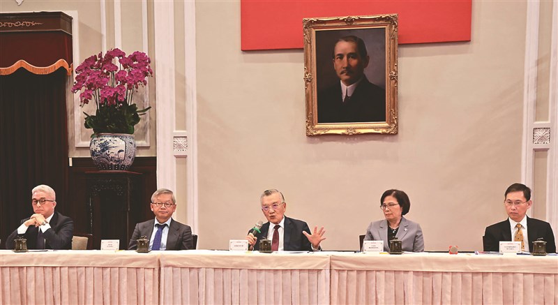 2025亞太經濟合作會議(APEC)落幕,台灣領袖代表林信義(中)與代表團成員國安會諮詢委員徐斯儉(左起)、國科會主委吳誠文、行政院政務委員楊珍妮、外交部國際組織司司長孫儉元,昨出席記者會說明此行成果。圖/黃義書