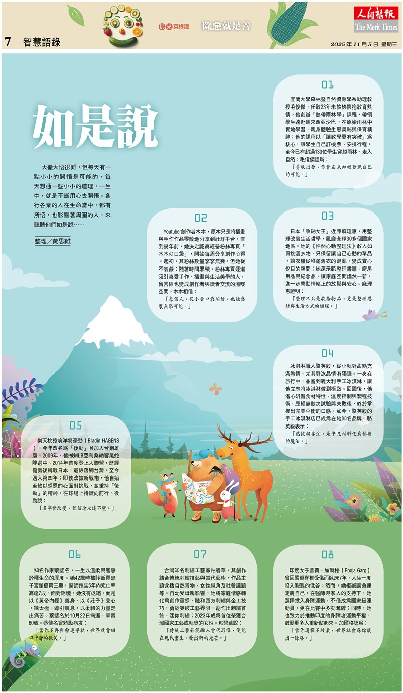 宜蘭大學森林暨自然資源學系助理教授毛俊傑,任教23年來始終懷抱教育熱情。他創辦「熱帶雨林學」課程,帶領學生遠赴馬來西亞沙巴,在原始雨林中實地學習,親身體驗生態奧祕與保育精神;他的課程以「讓教學更有突破」為核心,讓學生自己訂機票、安排行程,至今已有超過130位學生穿越雨林、走入自然。毛俊傑認為: