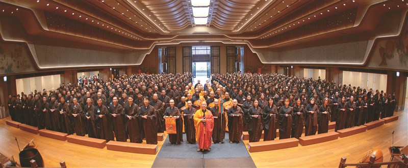 佛光山惠中寺2日舉辦「佛光山中區道場2025年甘露灌頂三皈五戒」典禮,禮請佛光山住持心保和尚(前)證盟受戒。圖為近600位皈依受戒者與心保和尚、所有引禮法師大合照。圖/人間社記者吳雨彤