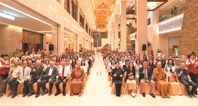「華彩萬象──石窟藝術沉浸體驗」1日於佛光山佛陀紀念館本館大堂開幕,館長如常法師(前排左6)偕中國國家博物館副館長丁鵬勃(前排右5)、佛光山榮譽功德主鄭經綸(前排左5)等貴賓,共350人出席。