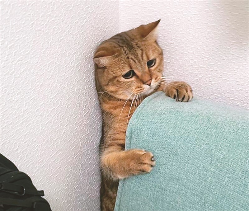社群平台「X」名為「みにら日記-MiniraDiary-」的日本網友發文寫道,「最近因為肚子變大而被卡住、動不了的貓」,照片上喵星人爪子抓著沙發椅背、後腳站立卻動彈不得,耳朵也微微下垂,表情好無辜。