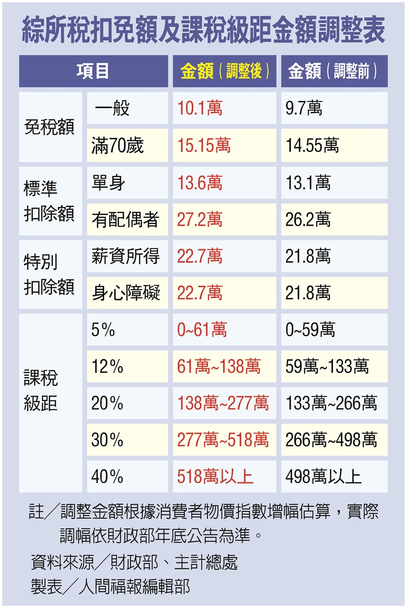 【本報台北訊】700萬戶納稅人將迎接減稅小確幸。主計總處昨天公布最新的消費者物價指數(CPI),物價累計漲幅已達4.13%,超過綜所稅法定調整標準的3%,明年免稅額、標準扣除額、薪資及身心障礙特別扣除額、課稅級距等四大項額度都將調升,後年5月報稅適用。