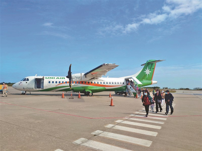 澎湖馬祖包機昨日首航,馬祖國家風景區管理處強調,包機為馬祖澎湖的離島間空中交通創舉,此次包機由民間發起,馬管處及連江縣政府並全力協助相關行銷推廣,期盼能拋磚引玉,吸引更多遊客在不同季節前來體驗馬祖的深度之美。昨首航遊客說,期待參觀媽祖巨神像、八八坑道等知名景點。圖為滿載著70位澎湖民眾的立榮航空包機,昨中午順利抵達馬祖南竿機場。圖/中央社