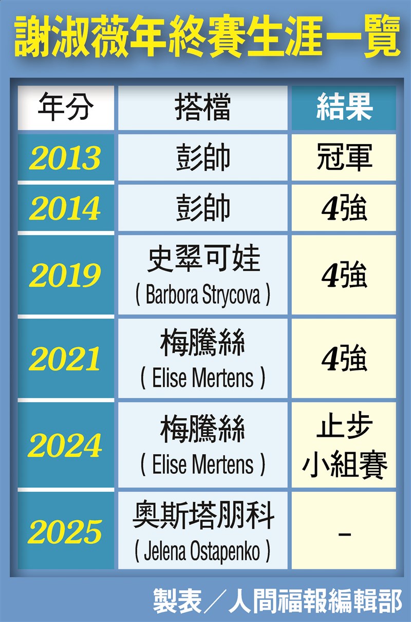 再闖WTA年終賽 謝淑薇力拚第2冠 張哲郢 |2025.11.07 語音朗讀 119觀看次 字級 大 中 小 謝淑薇再次挺進年終賽,力拚第2座冠軍獎盃。圖為去年謝淑薇於巴黎奧運女雙8強賽登場。圖/資料照片謝淑薇年終賽生涯一覽 製表/人間福報編輯部謝淑薇(右)與拉脫維亞好手奧斯塔朋科搭檔,共同備戰年終賽雙打賽事。圖/新華社 文/記者張哲郢專題報導隨著11月到來,網球賽季進入尾聲,網壇年終賽相繼登場,率先進行的職業女網協會(WTA)年終賽進行完4強,女雙一姐謝淑薇攜手拉脫維亞搭檔奧斯塔朋科(Jelena Ostapenko)在小組賽取得3戰全勝晉級4強,有機會挑戰自2013年後再度於年終賽封后。2013年是謝淑薇生涯首次取得年終賽資格,當年她在溫布頓網球公開賽與彭帥打下雙打冠軍,收穫生涯首座大滿貫賽金盃,並在年終賽延續好表現,首次參賽即奪冠。不過雙打年終賽規模今非昔比,12年前雙打年終賽僅有4組人馬參加,且採單敗淘汰賽制,現在則加入小組賽制度,並增加到8組,選手們要先從小組賽出線才能晉級4強,挑戰冠軍難度大增。先前謝淑薇曾在新賽制中兩度闖進4強,包含2019年以及2021年,但她都在打進決賽後敗北,今年她與奧斯塔朋科率先拉出小組賽2連勝後,已經鎖定個人生涯第5張年終賽4強席位。老將風采再現 67分鐘取勝5日,謝淑薇更進一步,和奧斯塔朋科在面對美國穆罕默德(Asia Muhammad)╱荷蘭舒兒絲(Demi Schuurs)比賽中,只用67分鐘就以6:3、6:1過關,完成小組賽全勝。這是謝淑薇在年終賽加入小組賽制度後,生涯首次在小組賽取得全勝,雖然小組賽首戰就率先丟掉1盤,但後續6盤比賽全數拿下,調整狀況十分出色。已經39歲的謝淑薇,隨著經驗成長,現在的雙打成績甚至比她30歲以前還出色。她透露,最簡單的原因是「享受比賽樂趣」。她認為,只有在比賽中有些好玩成分,不用給自己太大壓力,特別是賽前已經確定晉級。「百搭天后」謝淑薇在比賽中最讓對手頭疼,就是她那摸不著頭緒的出手角度,時常可以發揮破壞節奏的效果。搭檔奧斯塔朋科也不得不佩服謝淑薇的功力,她表示,2人就像互補一樣,總是能適時補上彼此需要的地方。上個月謝淑薇說,她有可能出戰2028年的洛杉磯奧運,年紀向來不是阻撓她前進的藉口。 前一篇文章 美國好手輩出 10人晉級年終賽 下一篇文章 澳洲德米納爾 增強體能站穩網壇 熱門新聞 01【閃文集】 駝峰天使2025.11.0402台中新社花海 重現經典卡通2025.11.0603魏碧糈 用茶講心教品德2025.11.0104【墨香流韻】一筆清香 一念無塵 梅適情2025.11.0205【營養專欄】破解糖尿病飲食4大迷思2025.11.0106【修行在人間】佛心的慈視62025.11.0207社論--做自己的數位主人2025.11.0208【看人間】老人應要活得快樂,而不是活得合理2025.11.0409盧世祥 以金繕工藝圓滿人間愛2025.11.0110南天寺30周年口述歷史 登英國期刊專欄2025.11.03 訂閱電子報 台北市 天氣預報 台灣一週天氣預報 相關報導 小蠻牛對決辛納 爭年終賽球王澳洲德米納爾 增強體能站穩網壇美國好手輩出 10人晉級年終賽野村延長賽致勝轟 軟銀日職封王MLB世界大賽 藍鳥搶先聽牌全運會落幕 高雄奪棒球壓軸金 作者其他文章小蠻牛對決辛納 爭年終賽球王澳洲德米納爾 增強體能站穩網壇美國好手輩出 10人晉級年終賽NBA拓荒者逆襲 雷霆吞本季首敗威能帝奪中職年度MVP 抱走4大獎樂天桃猿首封王 遊行萬人夾道慶祝