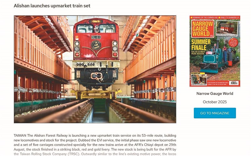 阿里山林鐵森里號 躍登國際 羅智華 |2025.11.09 語音朗讀 49觀看次 字級 大 中 小 「森里號」有貼心設計,包括自動門可降低乘客誤開車門風險,並搭配智慧顯示系統,讓乘客掌握班次。目前進行測試,吸引鐵道迷搶拍。圖/阿里山林業鐵路及文化資產管理處英國鐵道專刊窄軌鐵道雜誌《Narrow Gauge World》專文報導「森里號」。圖/阿里山林業鐵路及文化資產管理處「森里號」設有97席座位(含2席無障礙座位),硬體升級多組減震彈簧,能減少列車搖晃。圖/林業及自然保育署 【記者羅智華綜合報導】百年阿里山林業鐵路迎來新風貌,最新高階列車「森里號」不只融和在地文化、美學設計、導入雙駕駛控制等新技術,成為台灣山林鐵道轉型代表作,更再度躍上國際舞台,榮獲英國權威窄軌鐵道雜誌《Narrow Gauge World》10月號專文報導,以「阿里山林業鐵路推出新一代高階列車組」(Alishan launches upmarket train set)為題,介紹「森里號」特色與文化,展現林鐵歷史保存與技術創新成果,引起國際關注。多組減震彈簧 乘坐更舒適 斥資逾11億元的「森里號」,是阿里山林鐵首款搭載自動門與自動化旅客資訊顯示系統的列車。透過自動門設計可降低乘客誤開車門風險,並搭配智慧顯示系統,幫助乘客掌握班次、站點等資訊。技術層面上,「森里號」採用新型高效能柴油引擎,具備更強動力輸出,能因應阿里山多山多彎地形與高海拔氣候挑戰。此外,「森里號」的全新轉向架懸吊系統,結合多組減震彈簧,還能有效降低列車搖晃,提升乘坐舒適度。駕駛聯控系統支援兩組列車聯掛,則不只提升運能與編組彈性,亦更符合台灣與歐美四期以上環保排放標準,藉此展現林鐵對環境永續的重視,打造環保新里程碑。《Narrow Gauge World》自1996年創刊以來,長期關注全球窄軌鐵道與保存運動,是歐洲最具影響力的鐵道刊物之一。此次報導以全頁篇幅介紹阿里山林鐵全線升級工程與「森里號」列車啟用,指出列車導入多項先進技術,包括自動門、乘客資訊顯示與避震設計等,象徵林鐵邁向新世代。同時,英國姐妹鐵道威爾普蘭菲爾鐵路(Welshpool & Llanfair Light Railway)出版的《The Llanfair Railway Journal》亦於同月刊登阿里山林鐵專文,介紹「森里號」建造細節,強調其設計精神象徵「人與自然的和諧共生」特色。阿里山林業鐵路及文化資產管理處表示,「森里號」命名源自阿里山鄒族語「EVI」,意指「森林」。其設計是由林鐵及文化資產管理處攜手台灣車輛公司、堺建築等單位共同打造,融和林鐵歷史脈絡、地形特色與文化意涵,展現從海拔30公尺的嘉義站一路攀升至2451公尺的祝山站、穿梭平原至高山林間、連結在地與世界等設計理念。定位高階列車 明年起營運不僅如此,外觀設計亦亮點十足,「森里號」承襲林鐵經典的黑色蒸汽火車頭與紅色柴油機車色系,並融入日出印象,採「林鐵黑、阿里山紅、聖光金」三色塗裝,象徵山林日升、文化傳承與技術創新。車廂內部也同步升級,包含照明空調、廁所設備、影音廣播與監控系統等皆導入新規格。文資處表示,「森里號」共採購5輛機關車與26節車廂,定位為高階列車,票價將與現行「阿里山號」區隔,以提供多元選擇給不同客群需求。未來除嘉義至阿里山的長程路線外,也將規畫區間行駛與特色專列,讓旅客能深入探索沿線生態、人文與產業,促進山村聚落觀光,打造全方位鐵道旅遊體驗。「森里號」仍在測試,預計2026年投入嘉義至阿里山營運,與「阿里山號」共同服務大眾,展現台灣山林鐵道的經典文化與特色。 前一篇文章 高市早苗:台灣有事 日本擬行使集體自衛權 下一篇文章 鳳凰今轉強颱 周三、周四恐登陸穿台 熱門新聞 01【閃文集】 駝峰天使2025.11.0402台中新社花海 重現經典卡通2025.11.0603南天寺30周年口述歷史 登英國期刊專欄2025.11.0304十方禪林40周年 教界高僧大德同賀2025.11.0305旅人心靈寶典《365日》 贈台中通豪大飯店 2025.11.0306一針一線60載 林全誠繡出神韻人生2025.11.0307【傾聽你我他】別為金錢傷感情2025.11.0308看見 電子 穿牆而過 2025.11.0309【觀我望己】 追日,散策旅程(上)2025.11.0310【民俗資產】 山林守護者:阿里山受鎮宮2025.11.03 訂閱電子報 台北市 天氣預報 台灣一週天氣預報 相關報導 鳳凰今轉強颱 周三、周四恐登陸穿台 高市早苗:台灣有事 日本擬行使集體自衛權電塔變身巨獸 奧地利新地標物價漲幅達標 700萬戶迎減稅小確幸25億顆野生種子 地球保險庫毛線編織善念 百萬件手作傳愛 作者其他文章QS亞洲大學排名 佛光大學首登榜佛光山大學校長論壇 永續佛學教育佛光人清淤不停歇 用愛與熱食送暖佛光會啟動救災SOP 逾千人馳援光復台中綠美圖開箱佛大校長趙涵㨗 登世界前2%頂尖科學家