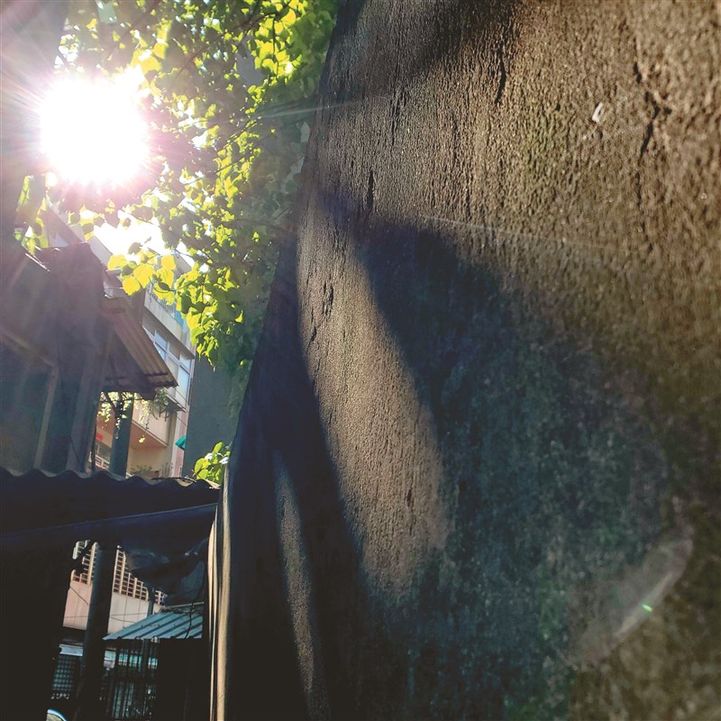走入巷子,陽光從樹間灑下,映照在斑剝舊牆上,這牆面感動了我,微微帶著墨綠色,是空氣溼度與水泥牆面滋養的青苔的共同創作成果,我想把透過樹影的陽光,與老牆壁的質感都記錄下來,貼近拍攝使得牆壁質感被清楚的紀錄。