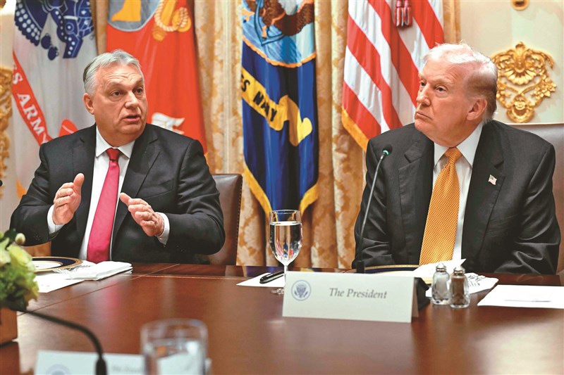 匈牙利總理奧班(左)7日在美國白宮內閣室與美國總統川普(右)會面時發言。