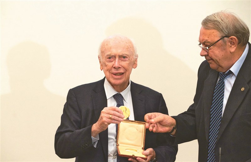 美國諾貝爾獎得主、生物學家華生(左)6日逝世,享耆壽97歲。圖為俄羅斯科學院院長福托夫(右)6月17日將一枚在拍賣會上賣給俄國商人的諾貝爾獎牌,歸還給華生。圖/美聯社