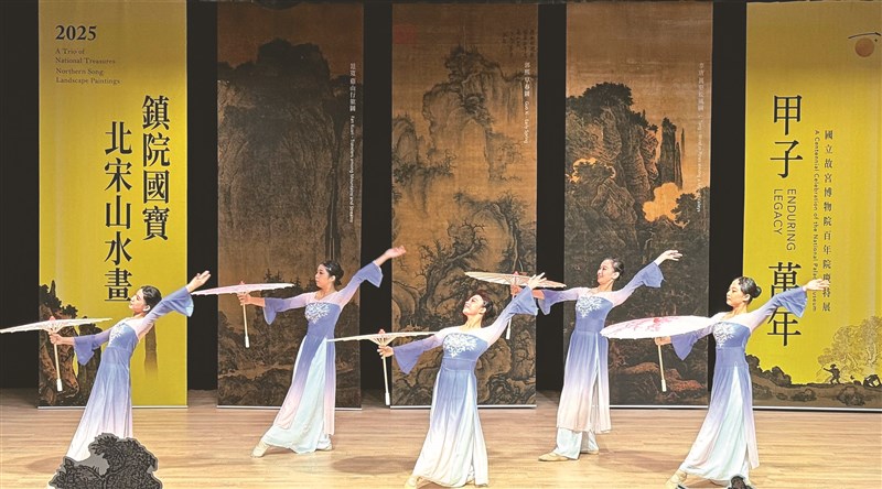 故宮南院「甲子萬年」特展開幕典禮,由雲林縣立蔦松藝術高中學生表演舞碼《初春新雨》,呼應山水畫境。圖/故宮南院提供
