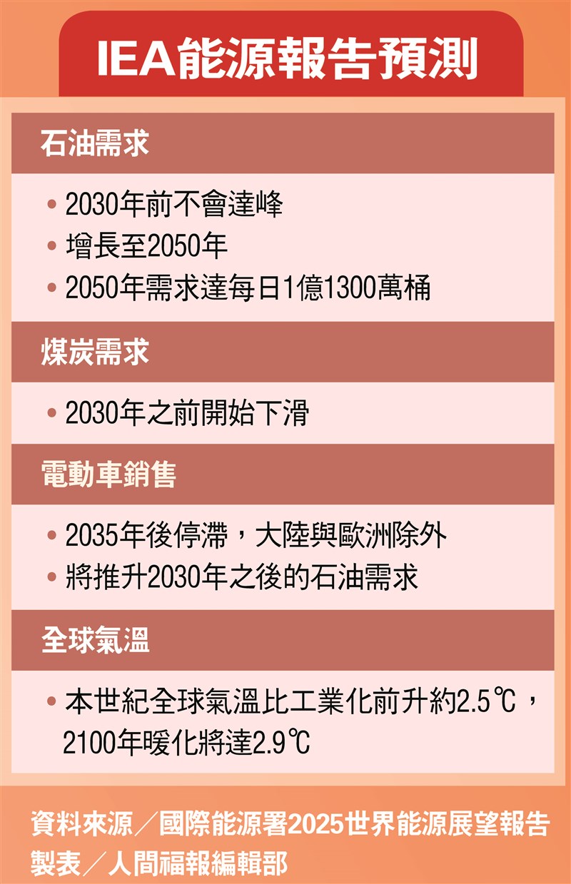 油氣需求恐續增至2050年 加劇暖化 |2025.11.13 語音朗讀 33觀看次 字級 大 中 小 IEA能源報告預測 資料來源/國際能源署2025世界能源展望報告 製表/人間福報編輯部環保團體12日在COP30會場,以行動要求制定減碳政策要公正轉型。圖/潘俊宏國際能源總署(IEA)12日發布最新年度《世界能源展望》報告,顯示石油與天然氣需求不會在2030年觸頂,而是持續增長到2050年。圖為厄瓜多爾蘇昆比奧斯省一家煉油廠的天然氣火炬。圖/法新社 【本報綜合外電報導】國際能源總署(IEA)12日發布年度《世界能源展望》報告,重新納入基於現行政策法規從事預測的「現行政策情景」(CPS)。該情境下,石油與天然氣需求不會如先前預測在2030年觸頂,將持續增長到2050年,使暖化劇增。該報告採用3種情境做出預測,其一就是CPS,假定各國不會實施任何額外能源政策,朝向潔淨能源轉型將面臨障礙;其二是「既定政策情境」(STEPS),預期各國持續實施有助解決氣候變遷的政策,迅速採用光電、風電、電動車等;最後是假設達成2050年淨零排放的「淨零排放情境」。IEA自2020年起一度刪除的CPS,美國川普政府則已施壓IEA納入該項更保守情境。川普1月回任後宣布美國將退出《巴黎協定》,並希望擴大油氣生產。在CPS下,全球石油需求將從去年每日1億桶,2035年增至1億500萬桶,2050年再達1.13億桶。另外,電動車在全球汽車銷售占比預計自2035年後停滯,這是因為部分地區缺乏政策支持,惟中國大陸與歐洲除外。在STEPS下,石油需求則將在2030年前後達到峰值,2035年後逐年下降。但與去年的報告不同,由於美國政策變化及液化天然氣(LNG)出口激增帶來價格壓力,天然氣需求在2030年代仍將持續增長。全球升溫幅度 2100年恐達2.9℃根據STEPS,本世紀全球氣溫預計將比工業化前水準升高約2.5℃。但在CPS下,2100年全球升溫幅度為2.9℃並將持續攀升。《紐約時報》12日報導,兩者似乎差異不大,但科學家發現,氣溫每上升0.5℃,就會顯著增加熱浪、洪水、乾旱與物種滅絕風險。 美國非營利組織「憂思科學家聯盟」政策資深主任克里特斯在巴西貝倫第30屆聯合國氣候變遷大會(COP30)說,CPS完全是出於政治動機,「美政府正制定錯誤政策,並試圖削弱全球氣候行動」。IEA執行董事比羅爾說,重新引入CPS是受到經濟與能源環境變化影響。今年報告也指,全球電力需求正上升,主要受先進經濟體與中國資料中心及人工智慧(AI)推動,開發中國家空調使用量增加也是1項主因。此外在所有情境,中國仍是全球最大再生能源市場,未來10年將占全球再生能源部署的4成5至6成。化石燃料 威脅逾20億人健康根據研究,全球約4分之1人口居住在距離運作中的化石燃料項目3英里(約5公里)以內,這可能威脅到超過20億人的健康,以及重要生態系統。國際特赦組織(Amnesty International)獨家向《衛報》分享的1份報告指出,近5億人(包括1.24億兒童)居住在距化石燃料設施不到1公里範圍內,而約有3500個新項目正在提案或建設中,可能再迫使1.35億人承受廢氣、火炬燃燒及溢漏汙染。目前正值第30屆聯合國氣候峰會(COP30)舉行,國際特赦組織祕書長阿涅斯.卡拉馬爾(Agnès Callamard)指出,化石燃料產業與其國家支持者長期以「發展」為名追逐利益,卻無視界限、肆意破壞環境並侵犯人權。她呼籲各國領袖應將人民置於談判核心,承諾全面、快速、公平且具資金保障地淘汰化石燃料,推動全民可及的永續能源轉型。 前一篇文章 陸醞釀新規 阻止美軍方獲取稀土原料 下一篇文章 美政府最快本周開門 航班延誤短期難解 熱門新聞 01WTA、ATP年終賽 獎金創新高2025.11.0702健保補充保費變革 政院急踩煞車2025.11.0703補充纖維、鈣、鎂、鉀 預防多種疾病風險2025.11.1104再闖WTA年終賽 謝淑薇力拚第2冠2025.11.0705【寬鼎畫語】 看不見的真相2025.11.1006【詩】再現綠川2025.11.0707佛光山大學校長論壇 盼教育融入佛法2025.11.0808【樹博士系列】土壤的祕密XV 水稻田減排新觀念IV 土地的溫柔革命 雲林大埤寫益生菌奇蹟2025.11.0909佛光山深耕紐西蘭 毛利族傳統禮致謝2025.11.0710星雲大師全集【傳記】百年佛緣─生活篇 我的衣食住行 5-52025.11.07 訂閱電子報 台北市 天氣預報 台灣一週天氣預報 相關報導 鳳凰襲台 蘇澳土石流、泥灌明利村鳳凰颱風來襲 桃園、宜花、澎湖今停班停課攝影師造池塘 重建沙漠生機COP30揭幕 關注氣候人權與森林鳳凰今轉強颱 周三、周四恐登陸穿台 阿里山林鐵森里號 躍登國際