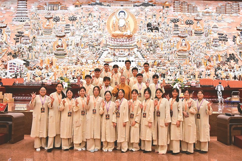 馬來西亞南馬區「覺有情」大專佛學生活營,八至九日在新馬寺舉行。圖為住持如彬法師(第二排中)與營員在大殿佛前合影。圖/人間社記者胡柏瑜