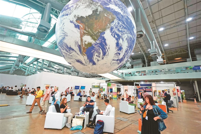 巴西貝倫舉行的聯合國氣候變遷大會(COP30)展館大廳裡,圍繞環保愛地球意象,引人省思。圖/美聯社