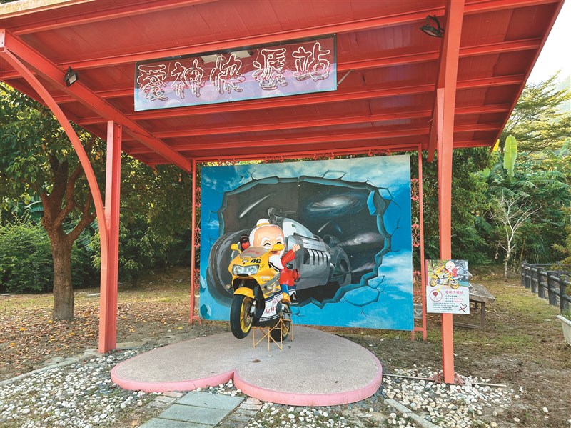月老廟旁有座月老亭,亭上標記:「愛神快遞站」。站內主角是白鬍長鬚,臉龐泛著紅光的月老騎士,騎著黃色重機車,身上背著愛情快遞包,包內放著姻緣紅線,看板寫著祈求愛情的簡單步驟,整體構圖充滿幽默與創意,吸引不少年輕男女拍照留影。
