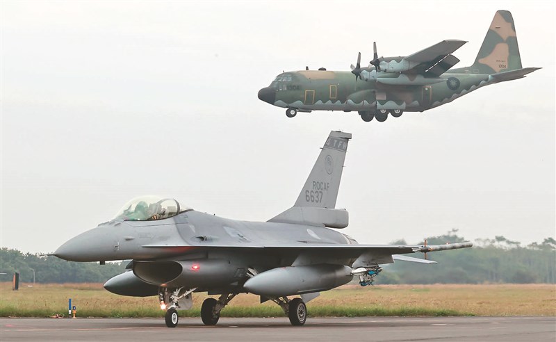美國通過3.3億美元對台軍售案,可助台維持F-16戰機、C-130運輸機和IDF戰機的戰備狀態。圖為國軍現役F-16V與C-130起降。