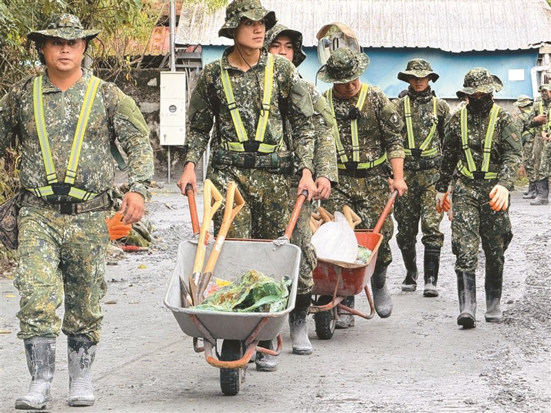 花蓮馬太鞍溪溢流阻斷後,展開道路清淤工作,國軍部隊協助打掃居家環境,配合清淤並執行交通管制。