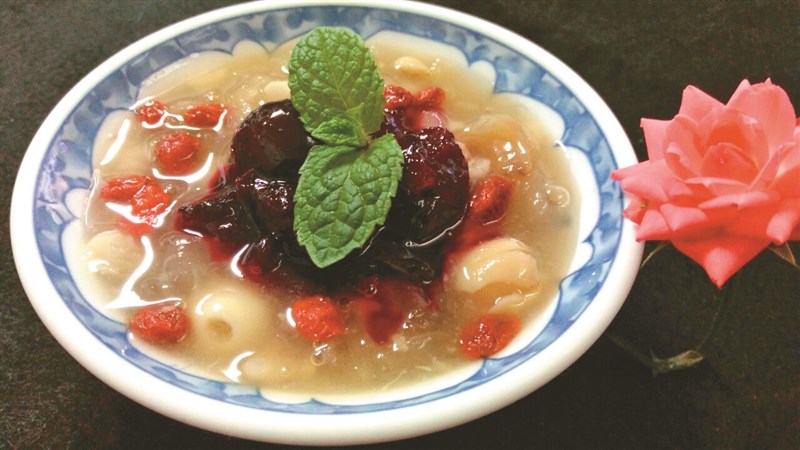 新鮮銀耳洗淨去蒂,撕剪成適口大小後泡水膨發,取一鍋加入銀耳併5倍水量,細火慢燉直至銀耳朵朵消融化成晶瑩滑湯;乾薏仁濾除雜質,泡水脹大後,加3倍水煮至Q綿軟碎粒;新鮮蓮子洗淨後待水滾入鍋,以中火煮至粒粒飽滿清亮盈香;銀耳、薏仁、蓮子再置於同一深鍋,灑入清洗後的枸杞、劃刀去籽後的紅棗顆數隨意,以小火慢滾約10分鐘,或至所有食材相和入味,放涼後分裝冷凍冷藏,冰涼溫食皆可口,配搭甜酸香味皆適宜。