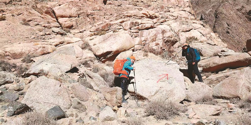 鄧李才和田才讓拿著地形圖、拄著登山杖,沿著山脊和溝壑向上爬。一邊探路,一邊用噴漆做標記。