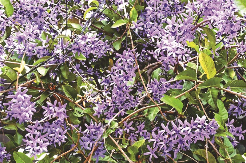 錫葉藤屬馬鞭草科常綠蔓性灌木,喜高溫與充足陽光。繁殖可用扦插法,也可用高壓法;土壤以砂質壤土為佳。適合種植在棚架或花廊旁,讓它攀爬生長,可作為綠蔭花卉,乘涼觀賞兩相宜。