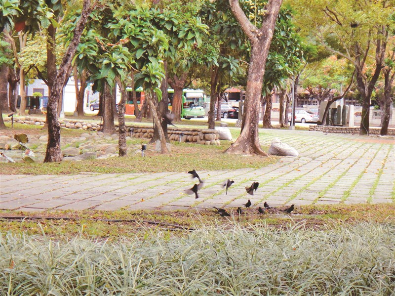 假日午餐後閒閒,到公園溜達,在磚道上走著走著,近旁草坪突然竄飛起一群約40來隻八哥,嚇了我一大跳,噢不,應該是牠們被我的到來嚇到了才對。