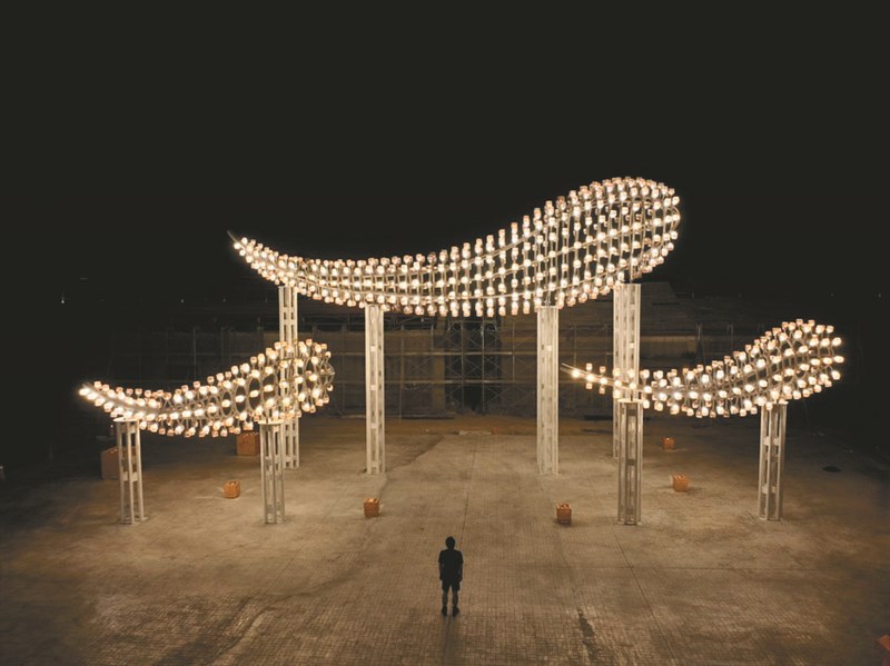 雲林縣府接管北港糖廠倉庫群並活化轉型,邀請藝術家楊士毅製作大型意象藝術〈光之祥雲〉,以糖結晶體為構思,加上手工琥珀色玻璃方塊堆疊製作,在夜間投燈時更展現不同風貌。圖/蔡維斌