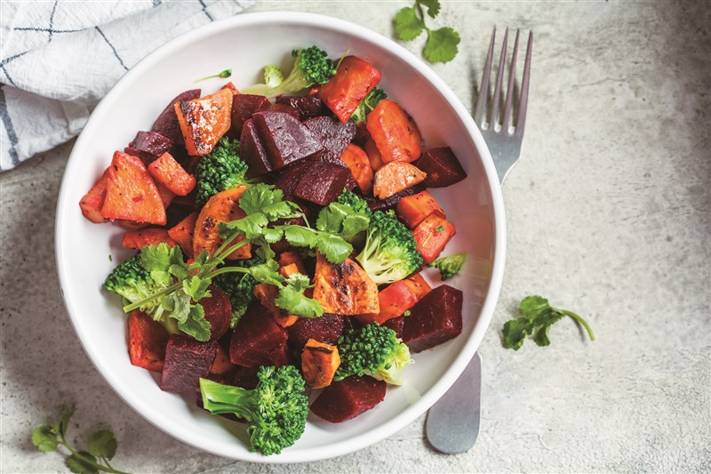 這道料理是將甜菜、胡蘿蔔、地瓜與青花菜等蔬菜用烤箱烤製。根莖類蔬菜含豐富膳食纖維與抗氧化植物化素,例如甜菜素(Betalains),有助肝臟代謝與血液淨化;而十字花科蔬菜也被視為「排毒」的好食材。作法是將蔬菜切塊後,淋上橄欖油、撒上薑黃與黑胡椒,放入烤箱烤至蔬菜柔軟微焦即可。運用烤製能夠保留蔬菜風味及口感,日常烹調簡單又方便。