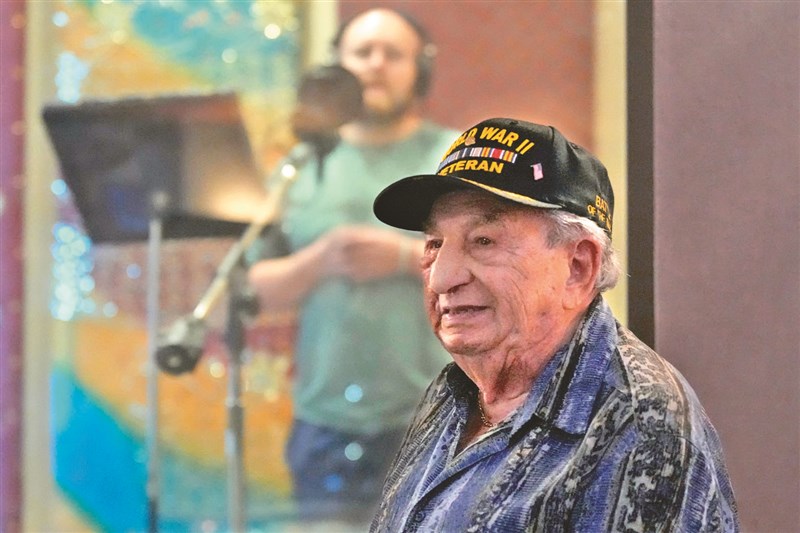 101歲二戰老兵洛克(前),聆聽歌手錄製他創作的歌曲。圖/美聯社