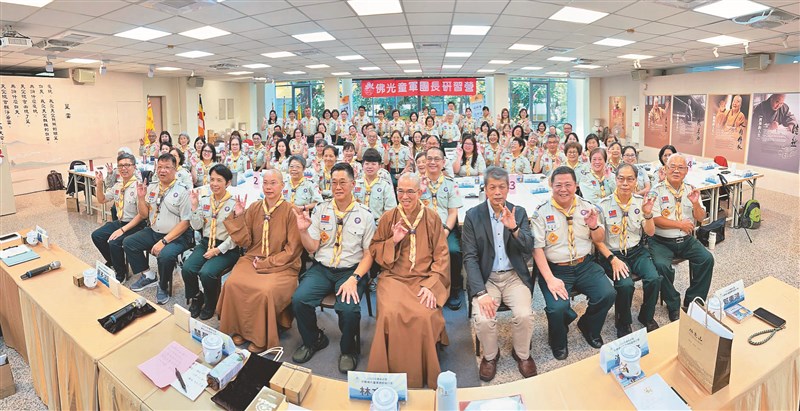 國際佛光會中華佛光童軍總團部11月15日至16日於台東日光寺,舉辦「2025團長研習營」。圖為慧是法師(前排右5)、覺多法師(前排左4)、林文輝(前排左5)與近百位童軍團長合影。圖/人間社記者王政魁