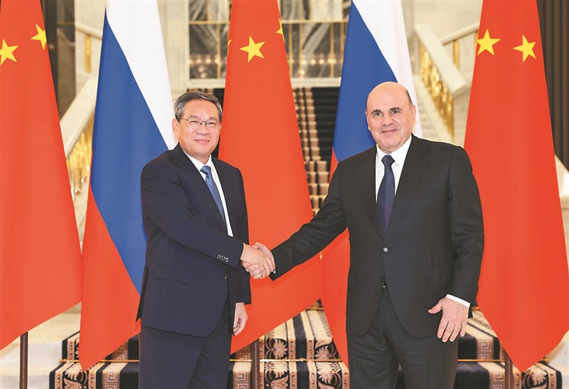 中國大陸國務院總理李強(左),17日在莫斯科與俄羅斯總理米舒斯京會面。圖/新華社