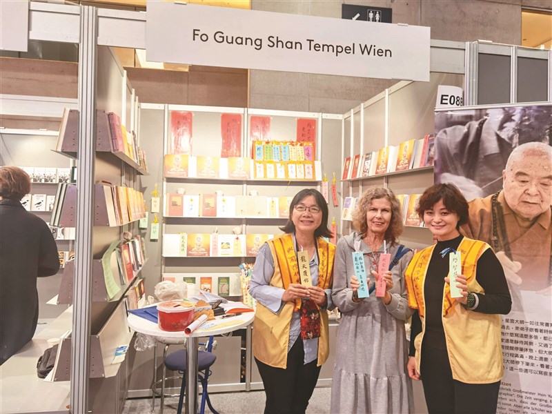 【人間社記者性慧維也納報導】第17屆維也納國際書展(Buch Wien)於12日至16日舉行,共吸引7萬2000人次前往參觀。維也納佛光山與國際佛光會維也納協會於展覽館第二區設置攤位,今年以德文版《獻給旅行者365日》與《佛法真義》為主軸,同時展出佛光山開山祖師星雲大師多部德文及英文譯作,向大眾介紹佛光山人間佛教的理念。現場並以手工製作的書法書籤結緣,一面為星雲大師的法語,另一面則為現場訪客書寫中文姓名,逾800位訪客駐足欣賞與詢問。