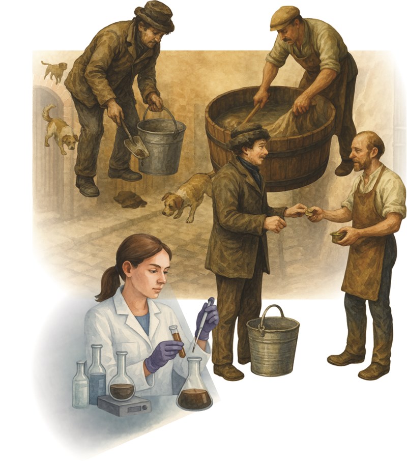 當時的皮革工坊,會依照糞便種類,給予不同價格收購。以食肉為主的狗,其糞便中酶含量高、效果最好,因而最受歡迎,其次是鴿子糞或雞糞。鴿糞富含尿酸鹽,也有助於分解油脂。