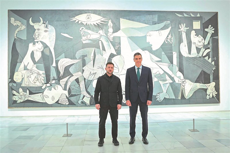 西班牙總理桑傑士(右)18日與來訪的烏克蘭總統澤倫斯基,參觀雷納索菲亞王后博物館,兩人在畢卡索名作〈格爾尼卡〉前合影。圖/法新社
