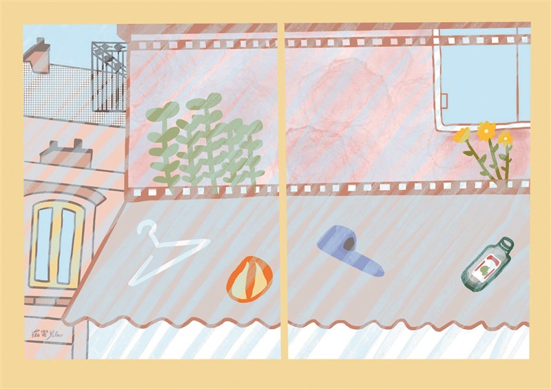 鄰居的遮雨棚又寬又長,採用較為堅固的鐵材建成,與其被形容為雨棚,更多人會稱它作屋頂。奇怪的是,當我偶爾從家裡看出去,發現很多莫名其妙的東西會毫無來由地出現在屋頂上,例如一支生鏽衣架、室內拖鞋、一顆扁掉的皮球、一罐橄欖油空瓶……屋頂的斜度非常完美,能維持良好排水,皮球和空瓶卻不至於滾落。某天開始,屋頂上甚至長出一叢叢花草。哪個天才會在這裡種花?那些雜物又是誰丟的?