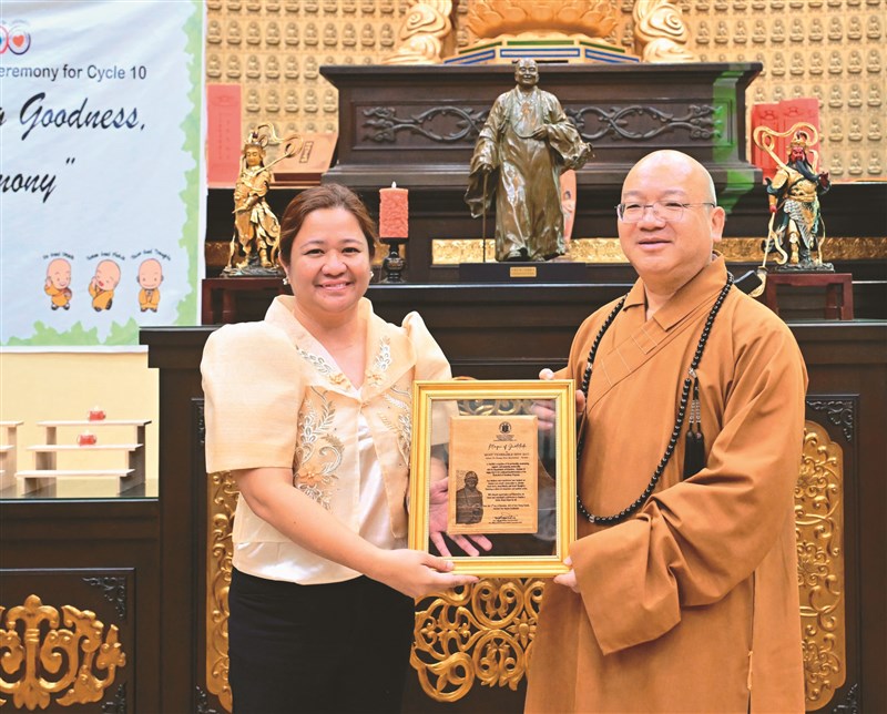 Sagay市教育局教育專案主管Josette P. Balandra博士(左),代表頒贈感謝狀給佛光山住持心保和尚。圖/人間社記者何曰昌