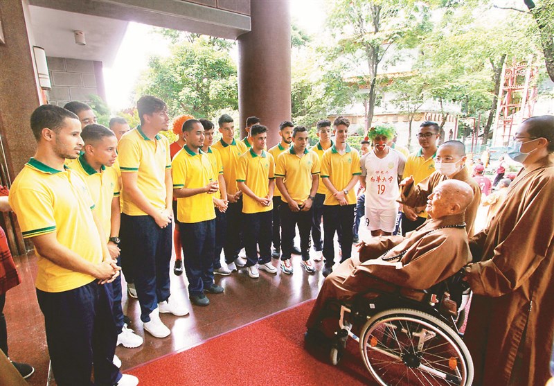 輪椅是星雲大師晚年平日的交通工具。圖為巴西佛光山如來寺「如來之子」組成的南華大學足球隊,感念大師的愛護與栽培,2020年8月下旬到佛光山參加供僧法會並面見星雲大師。圖/資料照片