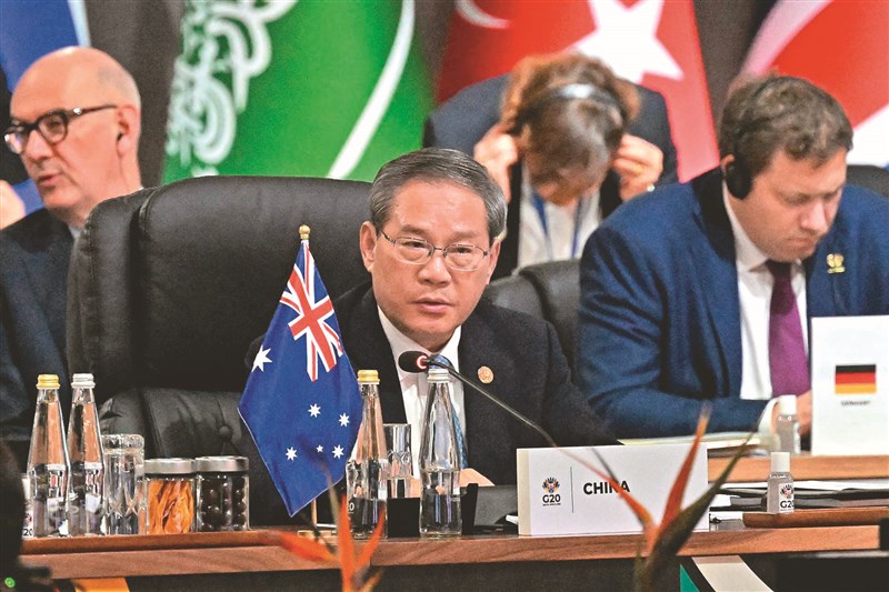 日本首相高市早苗22日出席在南非舉辦的G20峰會,中國大陸國務院總理李強(圖)也現身會議現場。由於中國對高市之前在日本國會發表的「台灣有事」言論不滿,兩人在G20峰會現場互動,成為各界關注焦點。圖/法新社