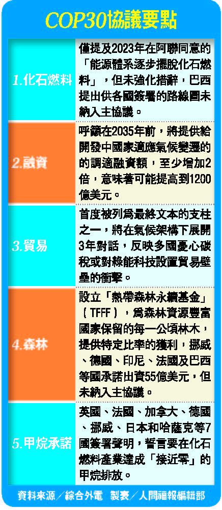 COP30落幕 氣候融資增至3倍 本報綜合外電報導 |2025.11.24 語音朗讀 11觀看次 字級 大 中 小 COP30峰會22日落幕,協議通過設立「熱帶森林永續基金」(TFFF),為森林資源豐富國家保留的每一公頃林木,提供特定比率的獲利。圖為亞馬遜雨林日前一片被砍伐的區域。 圖/法新社COP30協議要點 資料來源/綜合外電 製表/人間福報編輯部22日在巴西貝倫舉行的COP30上,大會主席柯利亞(前中)與工作人員商議。圖/新華社 【本報綜合外電報導】聯合國氣候變化綱要公約締約方第30次會議(COP30)延會談判,在巴西時間22日展開全體大會,194個締約國通過最終協定,呼籲努力在10年內,將氣候調適融資增至現在的3倍,但刪除了任何關於「化石燃料」的字眼,堪稱是一個「妥協下的氣候協定」,突顯全球減碳行動仍是牛步前進。在溫室氣體排放第二高國家「美國」缺席的情況下,本屆峰會在巴西環境部長席瓦致詞後落幕,各國談判代表露出如釋重負表情,互相擁抱慶祝。大會主席柯利亞離開會場時對記者表示:「非常開心!」會議發生小插曲,哥倫比亞談判代表對協定的減排計畫表達「反對」,要求文本納入「轉型脫離化石燃料,讓1.5℃控制升溫目標維持可行」,這迫使主席宣布會議暫停1小時,私下協商成功後才重開。此外,峰會先前曾因原住民示威兩度中斷,還曾因為一場大火引發恐慌性撤離。最終通過的協議「Mutirao」意指「共同努力」,象徵多方妥協下的成果。油國暫時勝利 歐盟妥協讓步峰會加班談判12小時,歐盟之前力推的「脫離化石燃料路線圖」未能寫入協定,中東等產油國家取得暫時勝利,歐盟妥協讓步。歐盟氣候、淨零和潔淨成長執委霍克斯特拉受訪時表達失望,「我們希望做得更多,更有企圖心,但這個世界和締約方會議就是如此運作」。前年杜拜峰會協定寫入「轉型脫離化石燃料」,今年峰會一度將「脫離化石燃料路線圖」寫入文本,但最後遭刪除,在此議題上不進反退。在過往扮演極大決策影響力的美國缺席困境下,外界本預期中國大陸能補上領導真空,出面化解僵局,但談判代表、歐洲議會議員埃卡特透露「大陸一直保持沉默」。種種跡象顯示,中方還沒有打算搶當氣候政治領頭羊。雖然化石燃料未寫入文本,主席柯利亞公開在閉幕會議提出兩種「路線圖」:一是減少森林砍伐,二是公正有序地脫離化石燃料,引起談判代表鼓掌叫好。巴西也支持這項體系外的倡議,將與90國建立化石燃料退場計畫。針對「氣候調適融資」,協定呼籲在2035年前增加到當前水準的3倍,也就是增至每年1200億美元(約新台幣3.7兆元)。此外,締約國決定發起「全球實踐加速器」和「貝倫達成1.5℃任務」,以加強國家地區自訂貢獻的減碳行動,以達成巴黎協定控制升溫低於1.5℃的目標。這次也通過「全球調適目標」,列出關於氣候調適59項指標,提供各國作為調適行動的指引,但非強制性質。COP31主辦國 土耳其接棒歐洲聯盟執行委員會負責氣候政策的執委胡克斯特拉表示,「我們不否認我們其實希望有更多成果、在所有面向更有雄心」,但他也表示,協議仍然「朝正確方向前進」。印度代表BASIC聯盟(巴西、南非、印度、大陸)表示:「我們完全支持COP30主席國,並肯定主席團隊的卓越努力,包括熬夜工作,確保我們從貝倫帶走有意義的成果。」。另外,澳洲總理艾班尼斯23日表示,已就由土耳其在2026年主辦聯合國氣候變化綱要公約第31次締約方會議(COP31)達成正式協議。 前一篇文章 川普促烏吞終戰協議 澤倫斯基:國家最艱難時刻 下一篇文章 陸方升高回應層級 王毅批高市越紅線 熱門新聞 01【島嶼拼圖】啜飲時光佳釀:探訪嘉義文化創意產業園區 2025.11.1802【閃文集】貓咪成長的魅力2025.11.1803【歲時.節氣】小雪──霜風一夜落寒林2025.11.2004新營講堂慢活閱讀 佛光家庭享受走讀趣2025.11.2005COP30首份草案 重啟化石燃料戰場2025.11.2006北島佛光山三皈五戒 點亮自性開啟智慧2025.11.2007【分享時刻】荷花與火車2025.11.2008【愛的關鍵字】 老壯世代的共居挑戰2025.11.2009佛大蔬食系 國際廚藝賽獲銀、銅牌2025.11.2010世界兒童人權日 照亮孩童未來 2025.11.20 訂閱電子報 台北市 天氣預報 台灣一週天氣預報 相關報導 川普促烏吞終戰協議 澤倫斯基:國家最艱難時刻無障礙狗公園 輪椅犬快樂奔跑轉廢成寶 動物雕塑活靈活現一戶一田永續城市 撥5成土地種菜世界兒童人權日 照亮孩童未來 中日陷僵局 陸要求撤回高市言論遭日拒絕 作者其他文章28點俄烏和平計畫 川普:非最終案越南洪災90死12失蹤 18萬棟房屋被淹美施壓 料烏27日前簽停戰協議孟加拉5.7淺層地震 至少6死百傷轉廢成寶 動物雕塑活靈活現習川熱線 傳聚焦台灣軍援軍售、TikTok議題