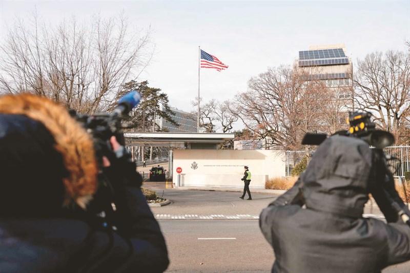 美國代表團23日抵瑞士日內瓦,和烏克蘭及幾個歐洲國家代表團,商討俄烏情勢與川普政府提交烏克蘭的停戰計畫。圖為媒體在外守候拍攝。圖/法新社