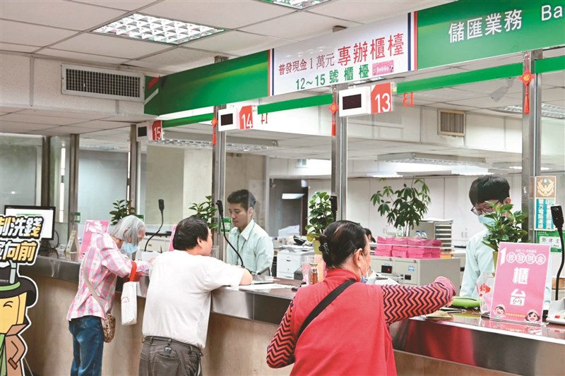 普發現金1萬元昨起開放郵局臨櫃領現,民眾可在全台1292間郵局據點就近領取。據官網統計,開放郵局領現首日,截至昨晚6時止,已有44萬3401人領取。領現首日人潮踴躍,但在郵局分流措施與現場引導下,整體動線順暢,民眾普遍對流程滿意。「安心、方便、避免詐騙」成為臨櫃領現的最大理由。圖為普發現金專辦櫃台。圖/中央社