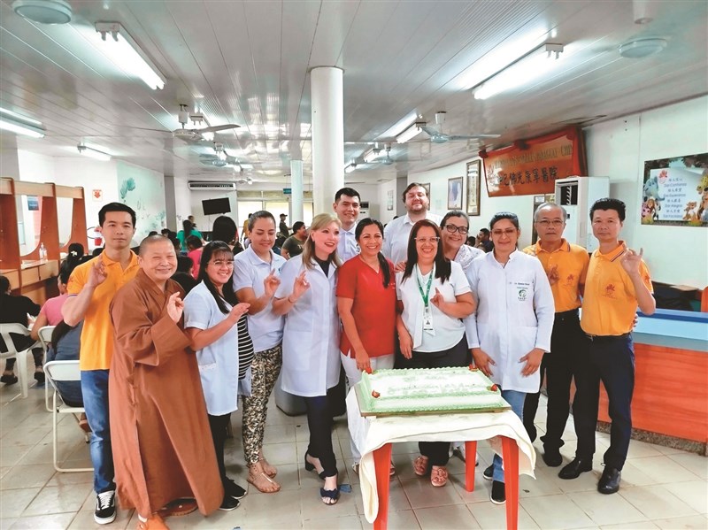 巴拉圭佛光山監寺有光法師(左2)與巴拉圭華人慈善基金會會長黃耀榮(右2)與院方醫護人員合影。圖/人間社記者pablo